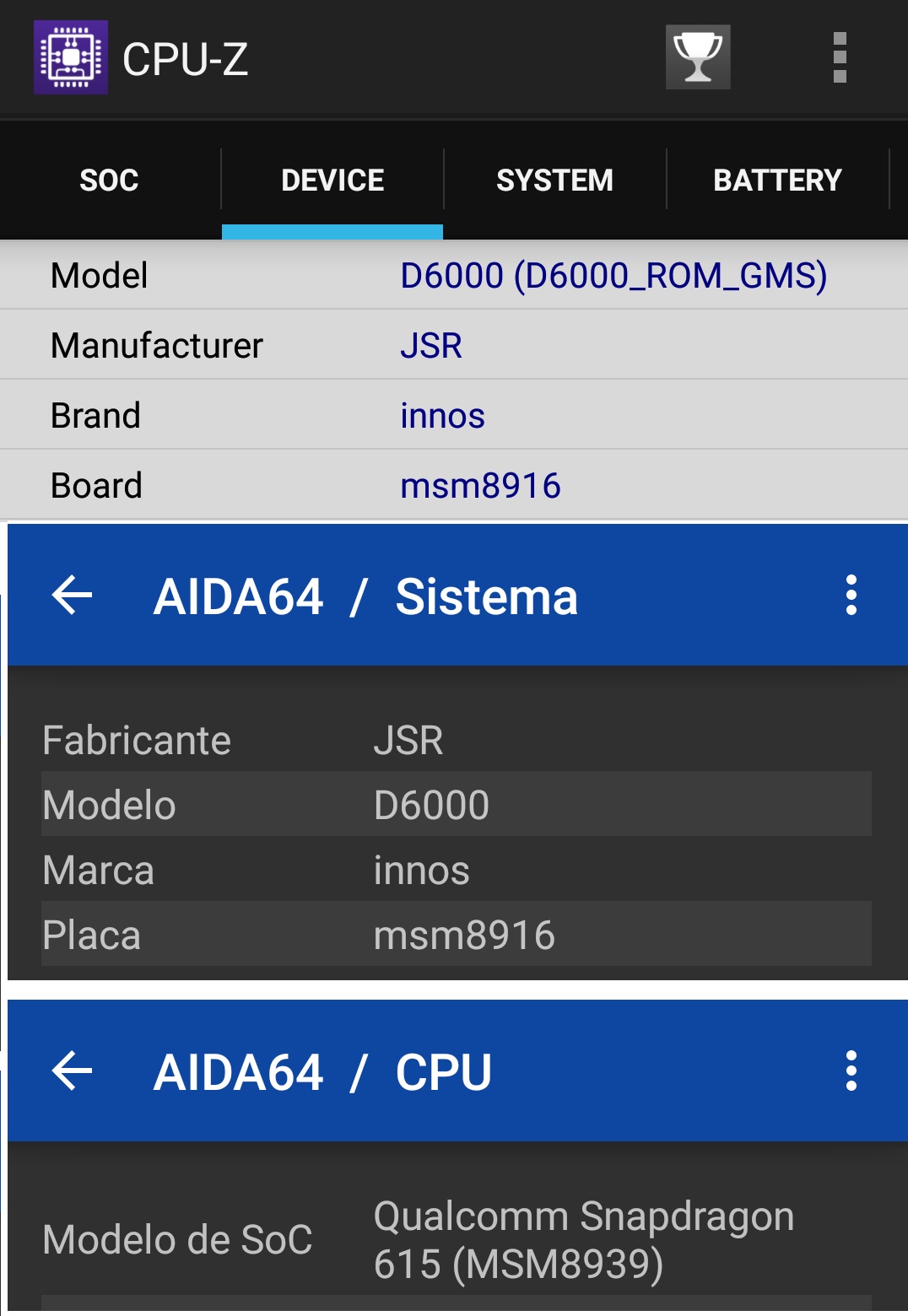 According to these applications, my phone Innos D6000 , has :