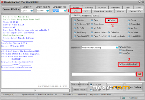 -Settings in Miracle Box (watch picture): MTK (1) -> Service (2). Check the box write (3)